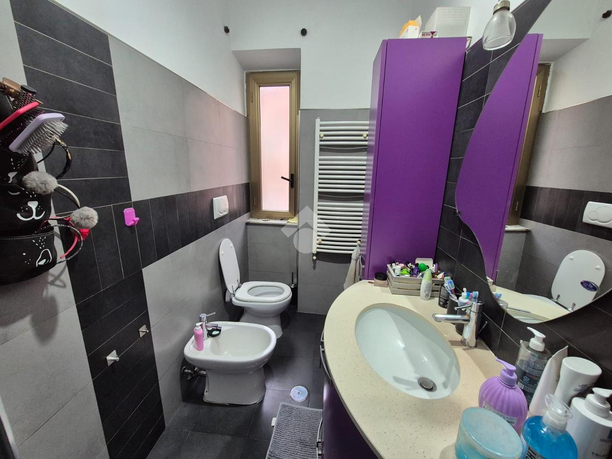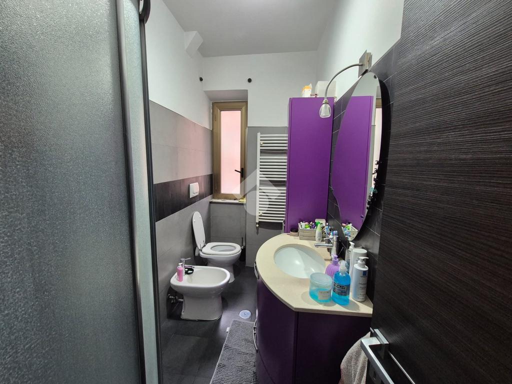 Il bagno, moderno e rifinito con gusto, è dotato di finestra e box doccia, e presenta una pratica disposizione che unisce eleganza e funzionalità.