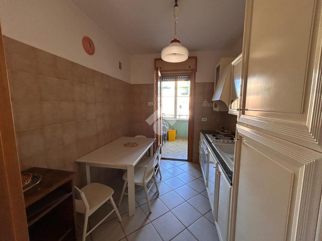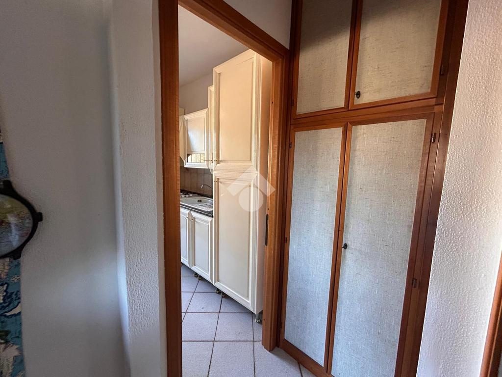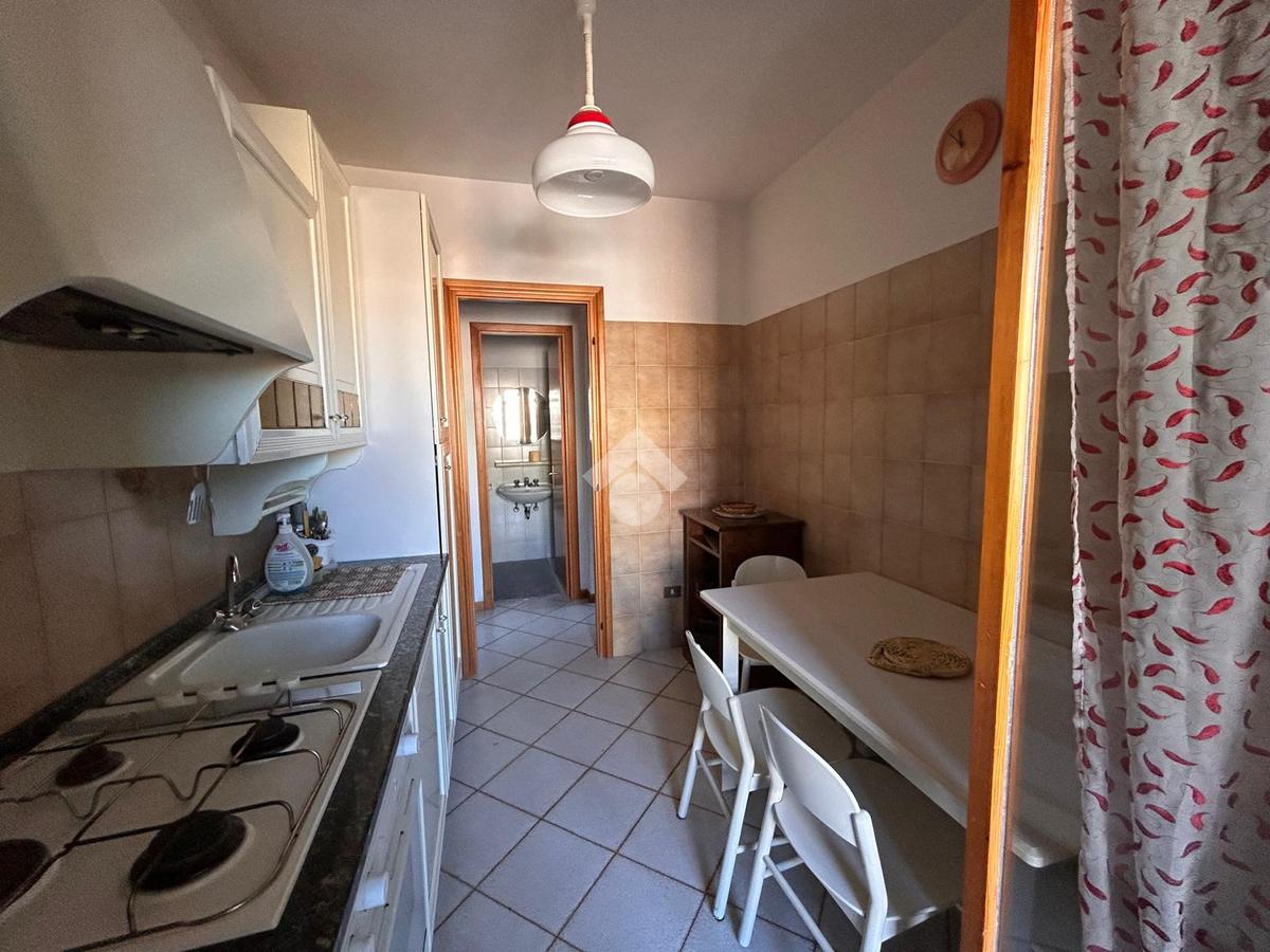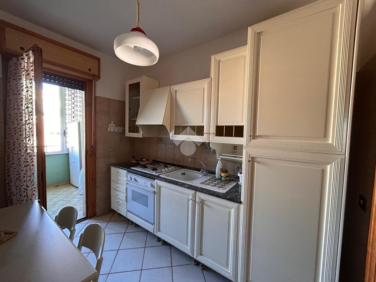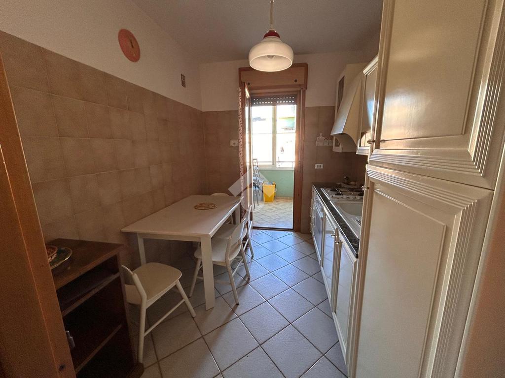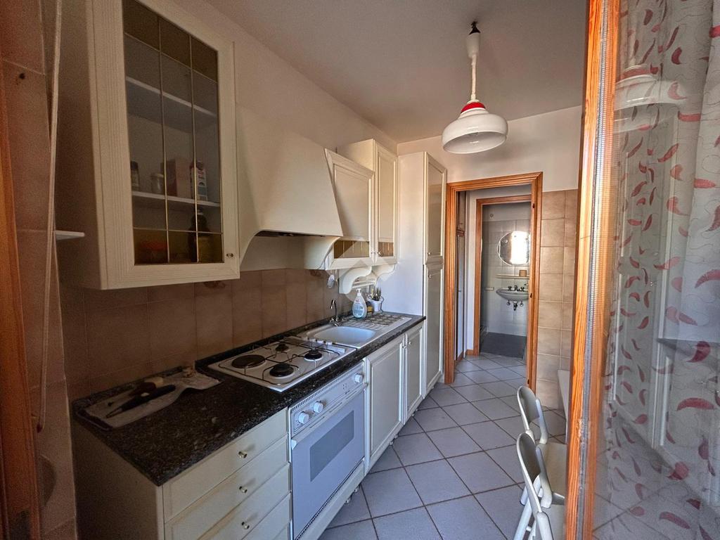 La cucina, separata e abitabile, è completamente attrezzata e vanta un secondo balcone verandato, chiuso con cura per creare un pratico spazio aggiuntivo ideale come lavanderia o zona dispensa.